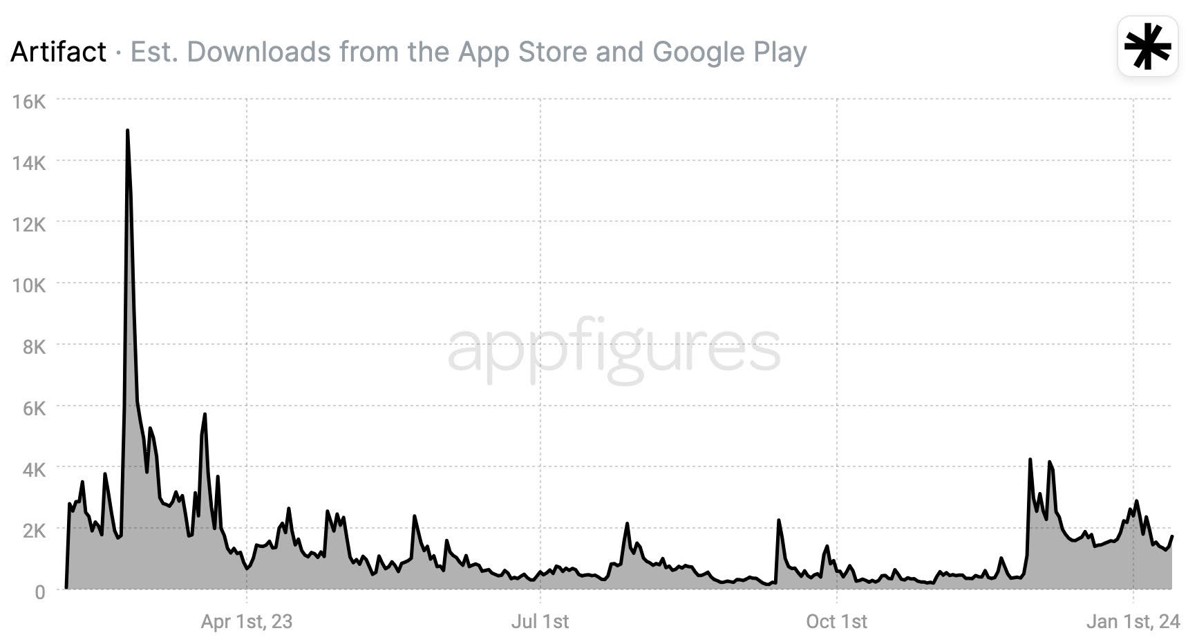 According to data from app intelligence provider Appfigures, Artifact saw an estimated 444,000 downloads since its February 2023 launch. However, a large part of those downloads, just under 100,000, arrived around its launch. By October 2023, the app had stalled, with only 12,000 new installs. In late November and early December, there was a brief spike again — perhaps a final push from Artifact’s team before making the decision to shut down. But that didn’t save the app from its fate.