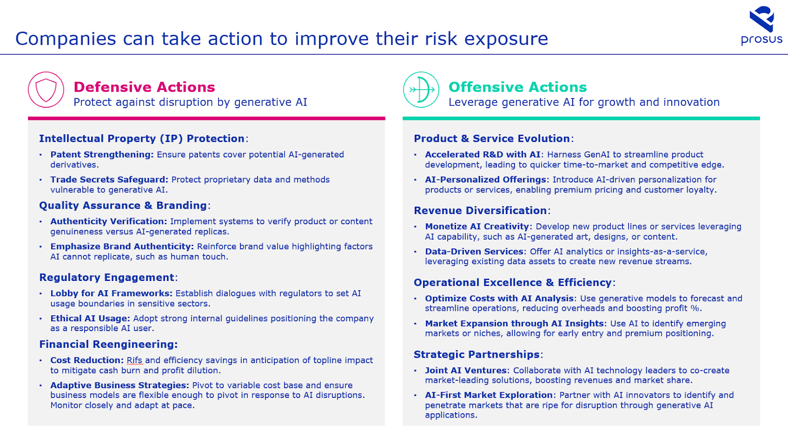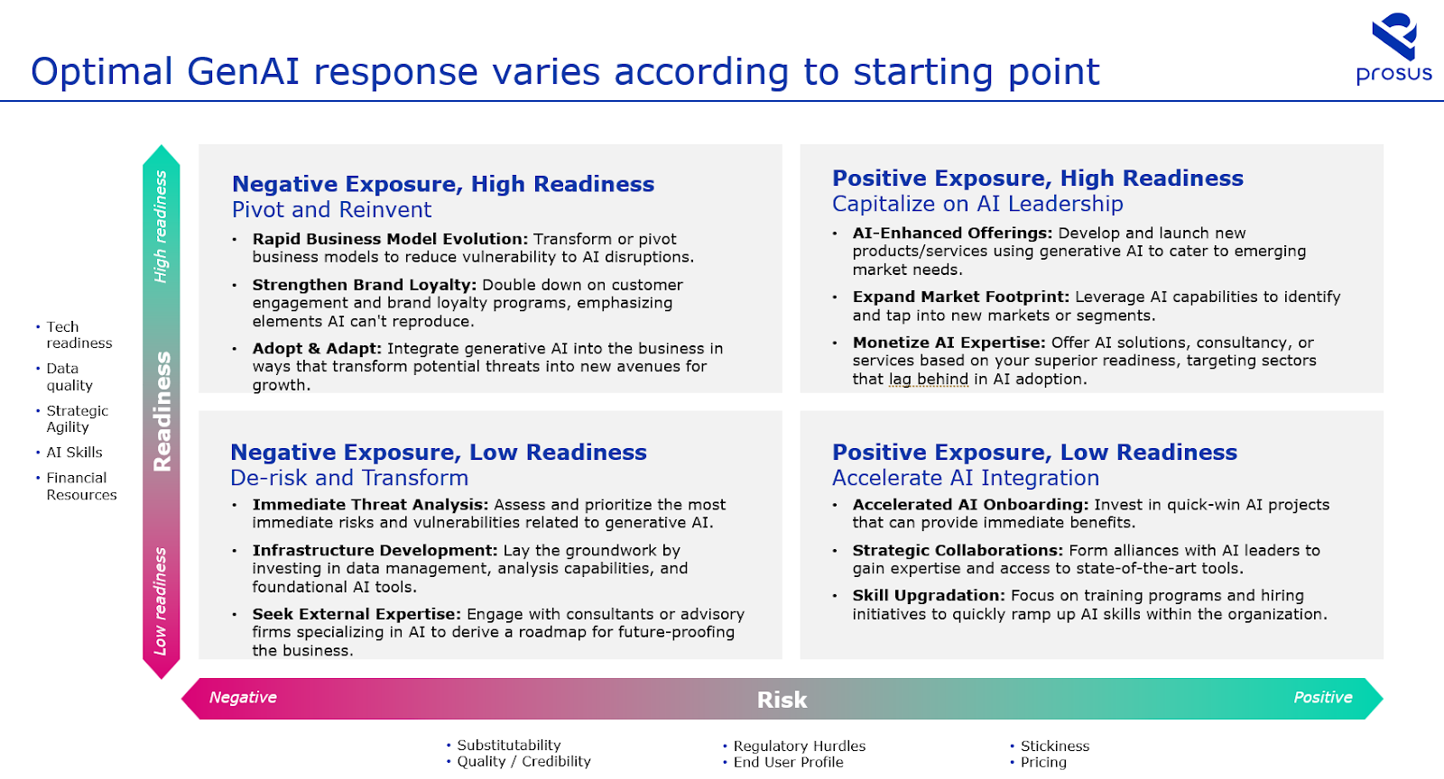 On the other hand, positive-exposure, high-readiness (Figure 2, upper right) companies are primed to capitalize on AI leadership. They’re in a great position to boost productivity, enhance user experience, and roll out new products and services. Our portfolio companies are leading the way here — from training proprietary models with their own data, to developing specialized copilots, to reinventing search and personalization on a massive scale.