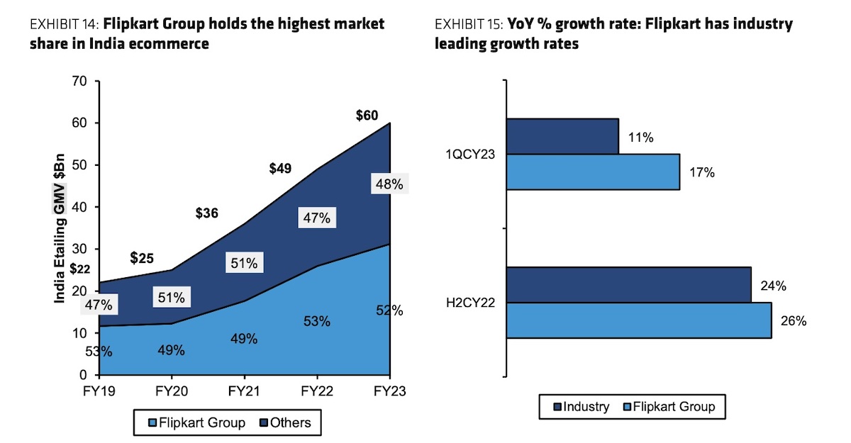 The report estimates Flipkart currently holds 48% gross merchandise value (GMV) share of India’s online retail industry, with its GMV reaching around $29 billion in FY2023.