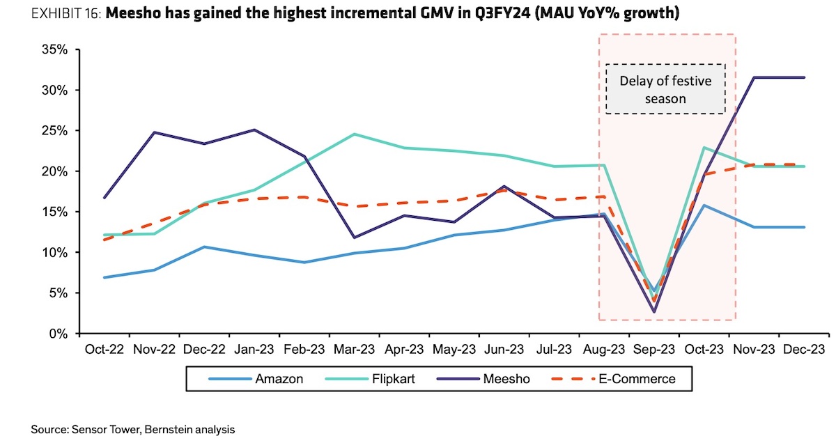 The Bengaluru-headquartered startup, which operates a social commerce platform, is currently at a GMV run rate of over $5 billion and its eponymous app grew 32% year-over-year in December 2023, far outpacing Flipkart’s 21% growth and Amazon’s 13% user growth over the same period, analysts at AllianceBernstein said in a note Wednesday.