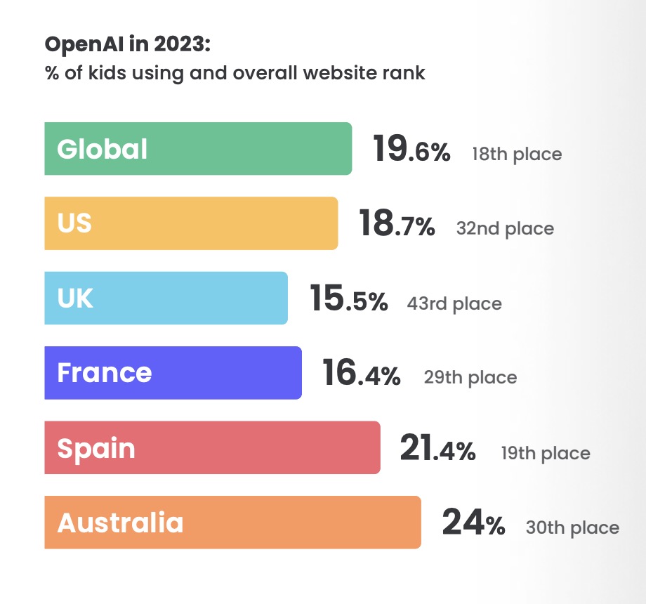 Because ChatGPT didn’t launch on iOS until May and on Android in July, Qustodio chose to look solely at the usage of OpenAI’s website. Globally, it found that almost 20% of kids accessed the site last year, making it the 18th most-visited site for the year. In the U.S., 18.7% of kids visited the site, and it was in 32nd place overall. Australia saw the largest adoption, as 24% of kids visited the site in 2023.