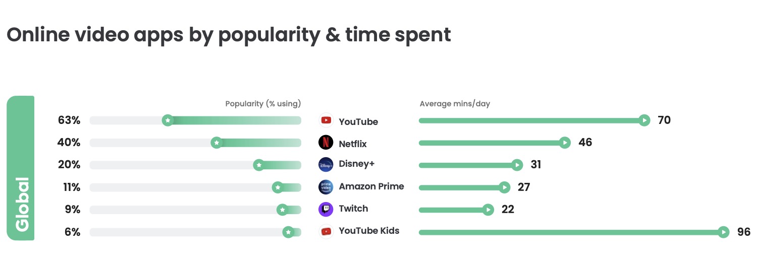 Though Netflix raised prices and cracked down on passwords in 2023, it still remained the second most popular streamer worldwide among kids, as 40% used the service. YouTube was in first place, with 63% of kids using it, and Disney+ was in third place, at 20%. However, Netflix was the only paid service to grow in popularity year-over-year, as other streamers saw their percentages drop, including Disney+, Amazon Prime Video, and Hulu, as well as livestreaming service Twitch, which dropped from 11% of kids using the service in 2022 to just 8% in 2023. Those who remained on Twitch this year boosted their viewing hours, watching 16% more livestreams globally at 22 minutes per day, on average.