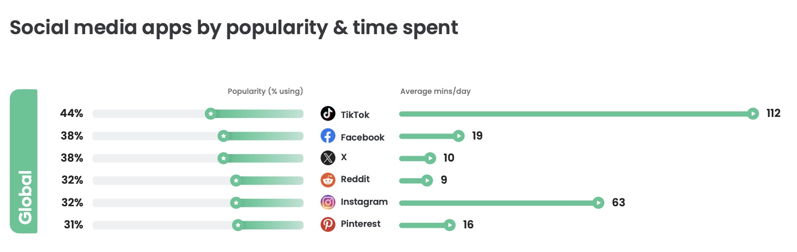Still, TikTok gobbled up far more time than its rivals, with usage of 112 minutes per day, on average globally, compared with 63 minutes for Instagram, 19 for Facebook, 16 for Pinterest, 10 for X, and 9 minutes for Reddit.