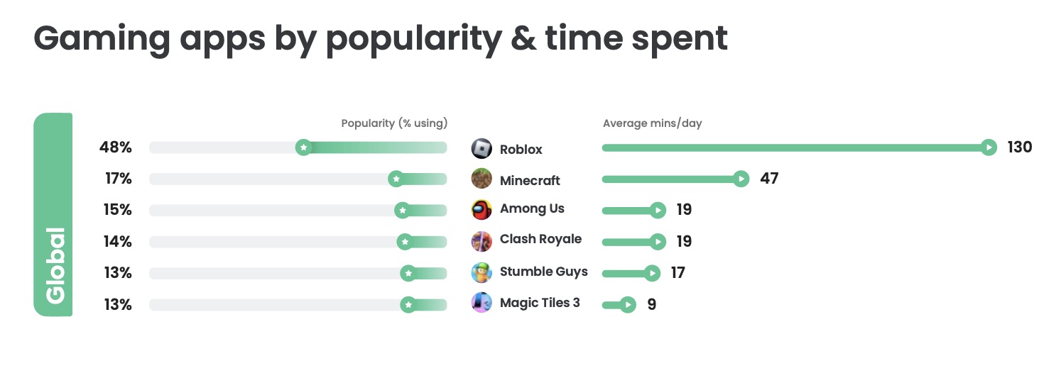 Among gaming apps, Roblox was the most popular, used by 48% of kids for an average of 130 minutes per day globally, followed by Minecraft, Among Us, Clash Royale, Stumble Guys, and Magic Tiles 3.