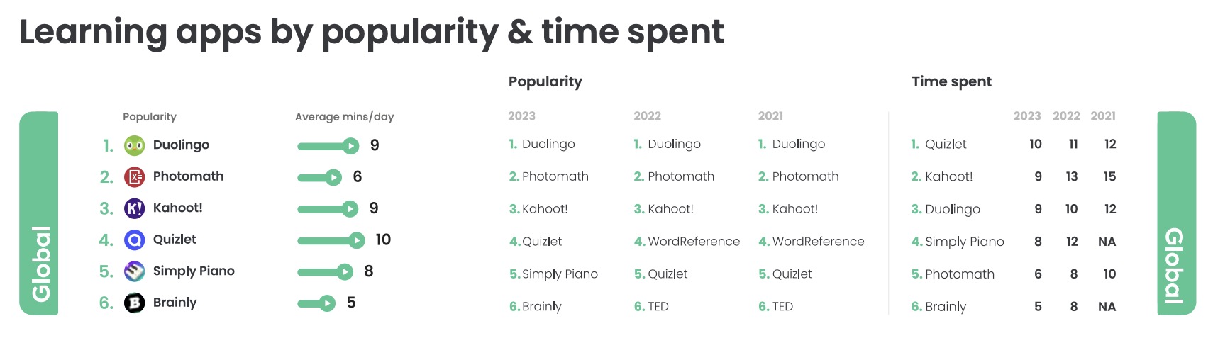 Kids also continued to use popular learning apps last year, like those provided by their schools, such as Google Classroom, as well as those in the educational space, like top apps Duolingo, Photomath, Kahoot!, Quizlet, Simply Piano, and Brainly.
