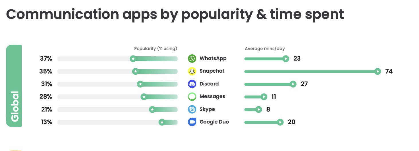 Related, Meta’s WhatsApp maintained a top spot as the most popular messaging app globally, used by 37% of kids, ahead of Snapchat (35%), Discord (31%), Messages (28%), Skype (21%) and Google Duo (13%). However, Snapchat was by far the app kids spent the most time on, with an average of 74 minutes per day, well ahead of its next nearest rival, Discord, at 27 minutes per day. If it had been categorized among the social apps instead of the communication apps, that would have made it the No. 3 app by time spent.