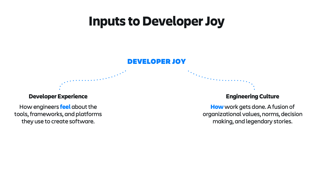 There are two main inputs to developer joy: developer experience and engineering culture.