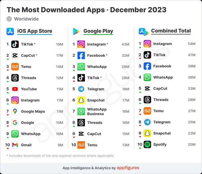Instagram Threads is gaining traction after growth stalled last year, which had some prematurely wondering if the app was already dead. New data indicates that’s not the case — in fact, Threads is continuing to grow, having tripled its downloads month-over-month in December, which gave it a place in the top 10 most downloaded apps for the month across both the App Store and Google Play.