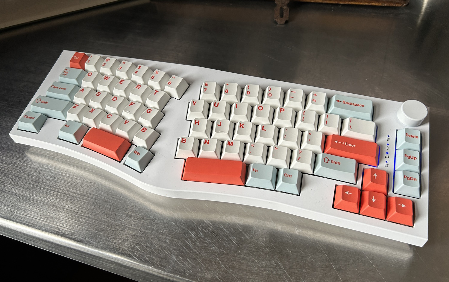 Here’s a keyboard with a lot of potential but that ultimately didn’t charm me. The Alice layout plus a number pad on the right, a knob and a tiny LCD screen. Seems like a great match for anyone who wants the ergo benefits of Alice but needs those numbers and doesn’t mind losing a little desktop space.