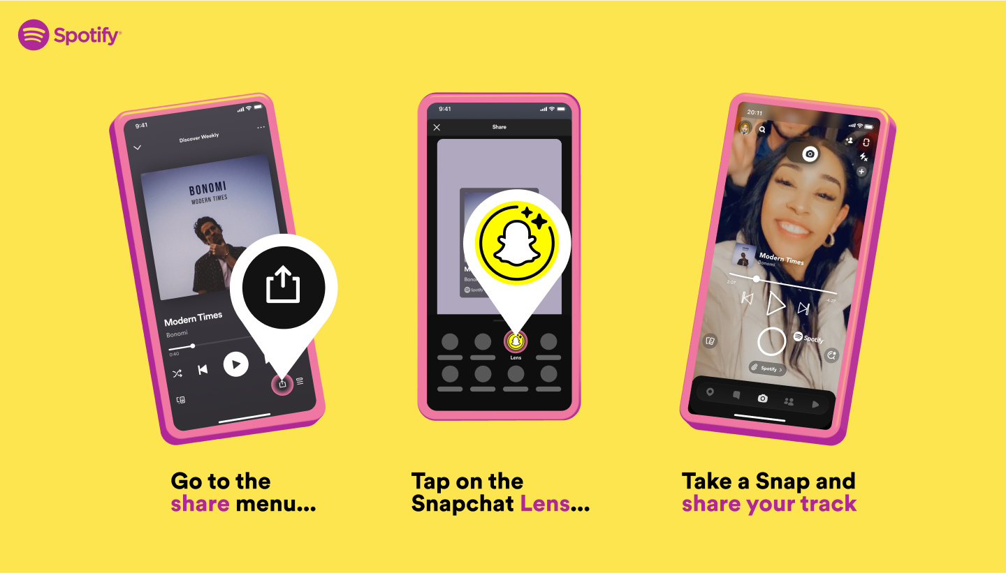 Spotify is expanding its partnership with Snapchat to introduce a new way for users to share their favorite songs on the social app. A new “Share Track Lens” feature lets you capture the world around you on camera while sharing a song. The lens will overlay the song title, artist name, cover art and a link to listen to the track on Spotify.