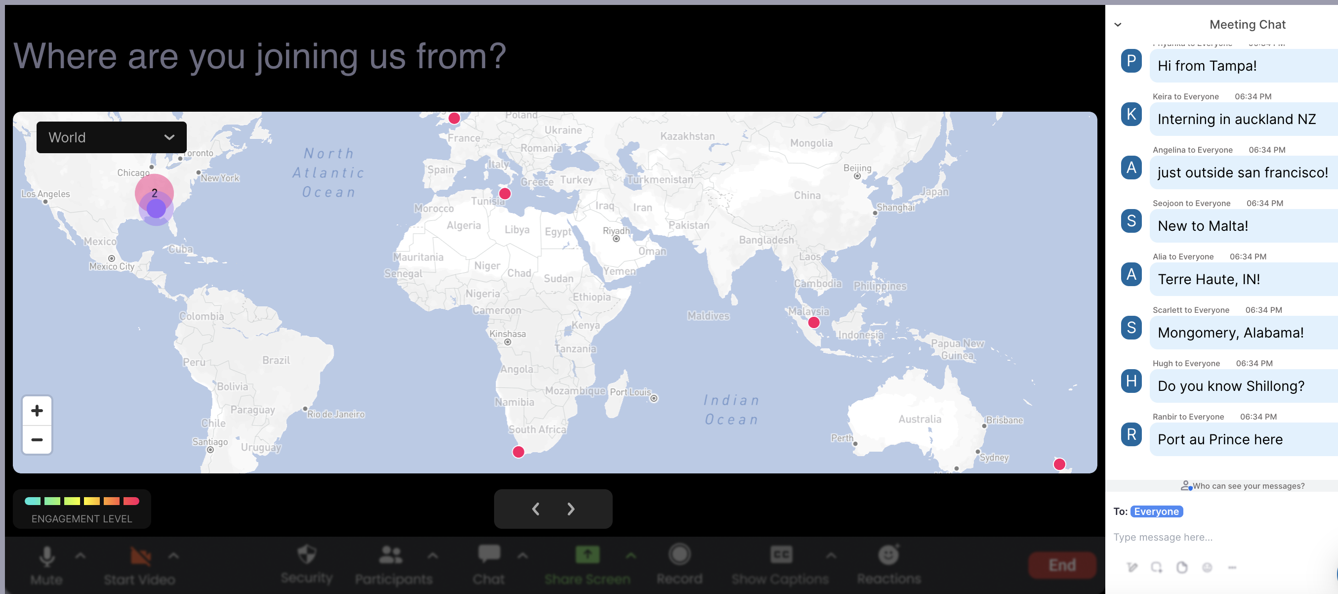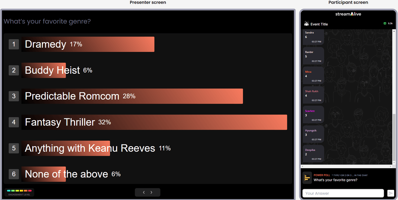 Audience members participate in interactive games — or “chat-powered” features as StreamAlive calls them — where their answers appear on the main screen. There are 10 features currently available, including AI-powered Q&As, polls, giveaways and more. For instance, “Winning Wheel” picks winners via a randomizer spinning wheel, “Magic Maps” visualizes where participants are streaming from across the world and “Wonder Words” involves a presenter asking a question and the responses appear as a word collage. The platform can automatically detect when a question is asked in the chat. Plus, an engagement level meter can be found at the bottom left corner of the screen.