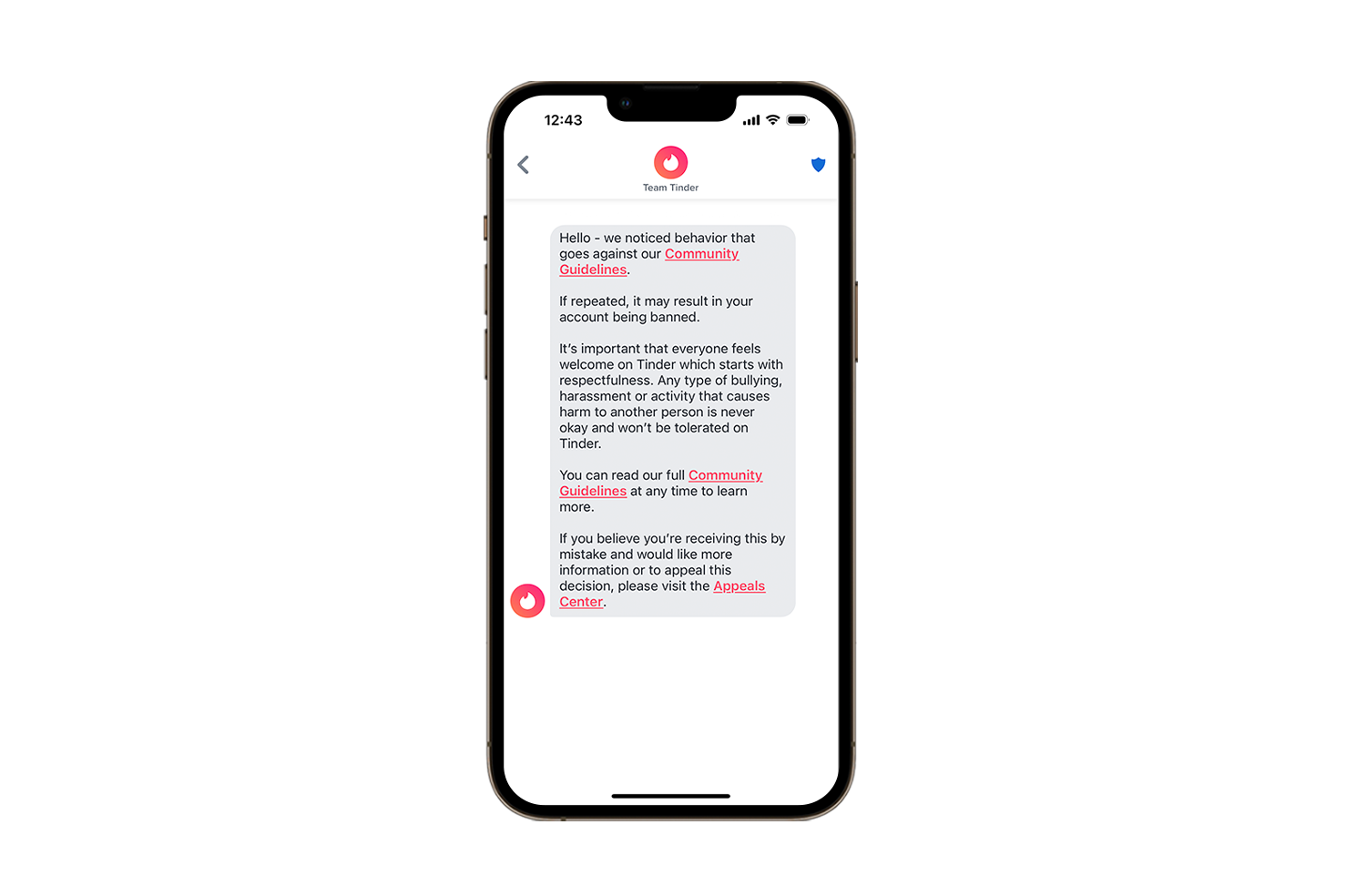 “Our Community Guidelines form the basis of a respectful ecosystem. These warnings are designed to provide transparency and alert users when they are not engaging in acceptable and respectful behavior,” Nicole Blumenfeld, Tinder VP of Trust & Safety Operations, said in a statement. “By providing greater transparency to users about their behavior, not only are we enabling them to immediately ‘course correct’ but also foster a better experience for the wider Tinder community.”
