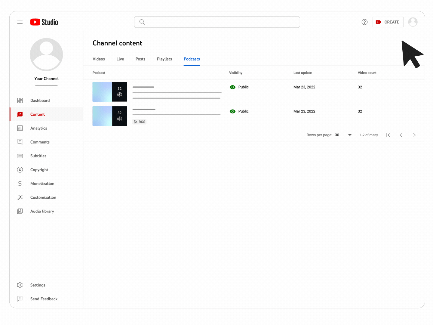 Podcasters can submit an RSS feed to YouTube by going to YouTube Studio, clicking the “Create” button in the upper-right corner and then selecting “Submit RSS feed.” There’s also an option to connect an existing podcast to an RSS feed in the Content tab. When a new episode is added to the RSS feed, YouTube will automatically upload the video to the channel and notify subscribers.