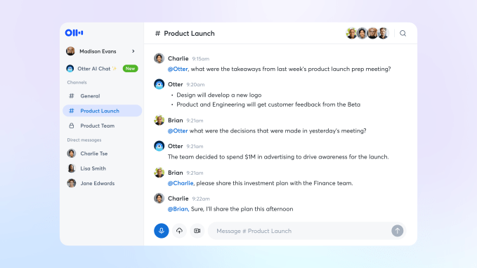 Another feature offers an AI chatbot that joins Otter’s channels where group chats take place. Here, the bot interacts like any other chat with another participant and can be invoked by anyone who asks Otter a question. For example, as users are chatting with each other, they could pause to ask the AI a question, like, “Hey Otter, what’s our revenue?” The AI chatbot will then answer your question.