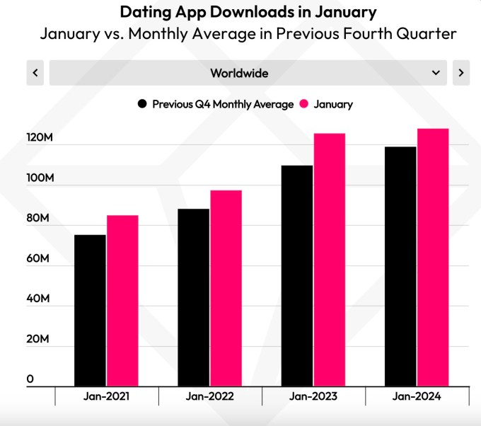 It may be Valentine’s Day here in the U.S., but the dating app market isn’t looking as promising as it used to. According to a new analysis by app intelligence provider data.ai, global downloads of dating apps saw only tepid growth year-over-year as of this January — a slight increase of just 1.9% to reach 128 million installs, compared with the 29% increase seen during the same time in the prior year. In the U.S., growth has also slowed, with a 2.38% year-over-year increase as of January 2024, reaching roughly 12.7 million installs, down from the nearly 16% growth seen in January 2023.