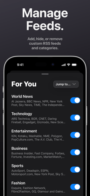 Getting started with the news app is simple as it comes with a default set of feeds for different categories of news, including World News, Technology, Entertainment, Business, Sports, Fashion and more. However, you can customize this experience if you choose, by adding or removing feeds from the app’s settings to make it your own.