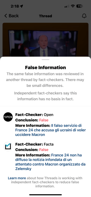Meta had announced in December that in early 2024 its fact-checking partners would be able to review and rate false content directly on Threads. In the meantime, Meta was only able to match existing fact-checks to “near-identical content on Threads,” it said. From the looks of the users’ reports of fact-checking now appearing on Threads, it’s a case of matched ratings, not the more anticipated direct fact-checking of Threads content that people are seeing.