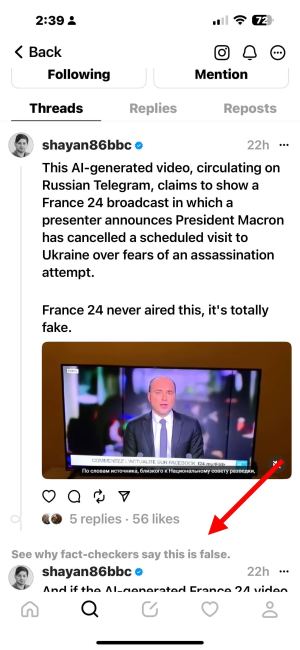 One example of this fact-check can be viewed here on Threads. It relates to a video that had been circulating in Telegram chats, which claims to be from a France 24 broadcast. However, the video had never aired or even been made — it was AI-generated, the fact-checking organizations both state.