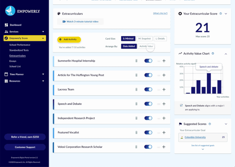 Empowerly touts its proprietary technology — The Empowerly Score — as the main differentiator between its competitors, which include CollegeWise, Solomon Admission Consulting and AcceptU. The Empowerly Score evaluates a student’s extracurricular activities (sports, community service, and clubs), achievements (awards and leadership roles), academics, and essays, then leverages predictive machine-learning models to generate a single score, highlighting the areas that students should improve to better compete against other applicants.
