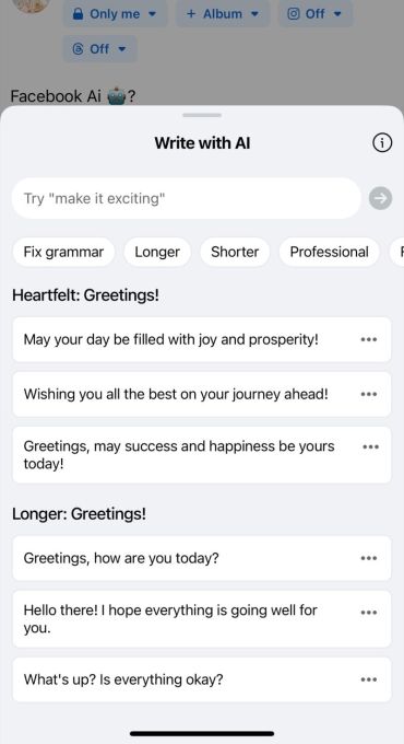 Cross-posting wasn’t the only area where Facebook is testing new features. Grujicic also shared a photo on LinkedIn that showed a test of a “Write with AI” writing assistant that could help users craft their posts.