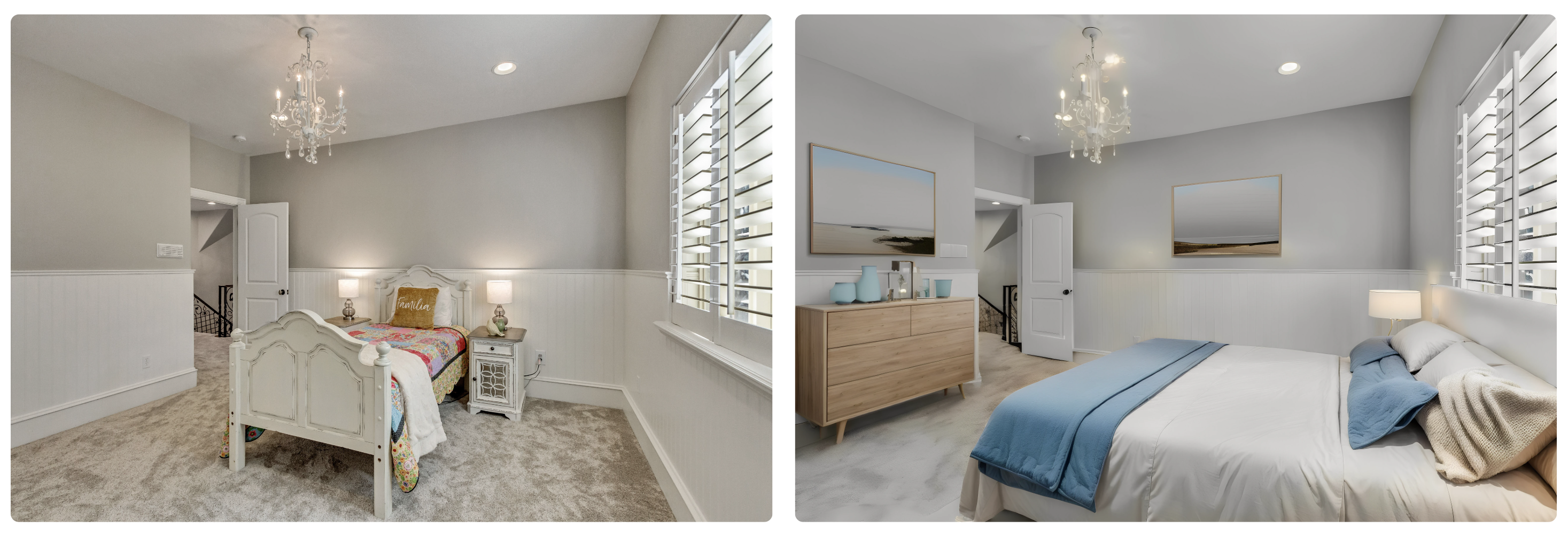 Virtual Staging AI’s model is able to analyze the 3D structure of a room and understand where the floor, roof, mirrors and doors are located. The AI model then chooses the best-fitting furniture based on the Realtor’s preferences.