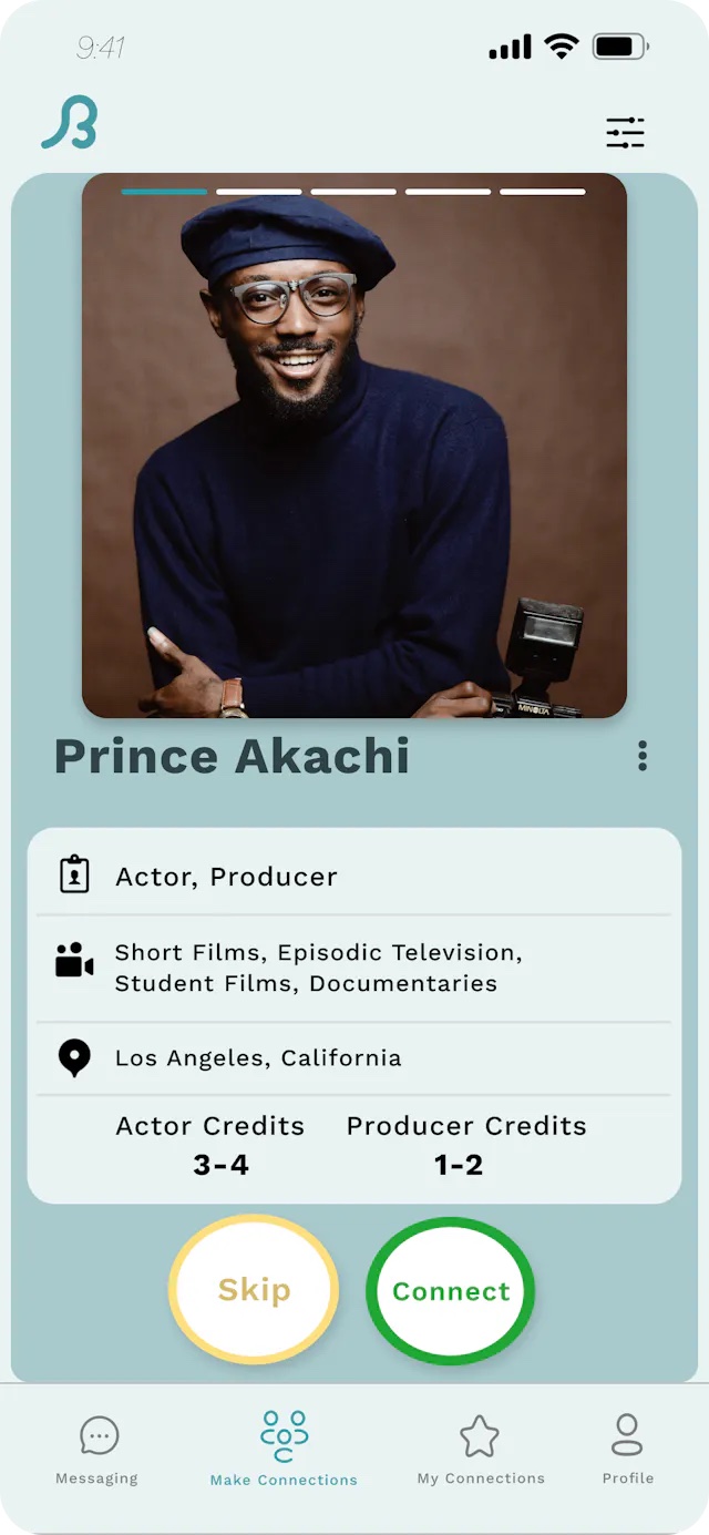 The app displays members in a card-style format with their photo, job title and additional details like what project types they’re interested in (i.e., short films, feature films, student films, documentaries, theater, music videos, episodic TV, reality TV, social content or commercials). You can filter by role, project, location and distance preference. It also shows mutual connections, which can inform you about their network and how it intersects with yours. The app then asks you to select skip or connect on a member, and if both users express a desire to link up, the app notifies them of the match.