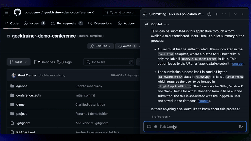 With that, new developers on a team can, for example, ask Copilot how to deploy a container image to the cloud and get an answer that is specific to the process in their organization. For a lot of developers, after all, it’s not necessarily understanding the codebase that is a roadblock to being productive when moving companies but understanding the different processes — though Copilot can obviously help with understanding the code, too.