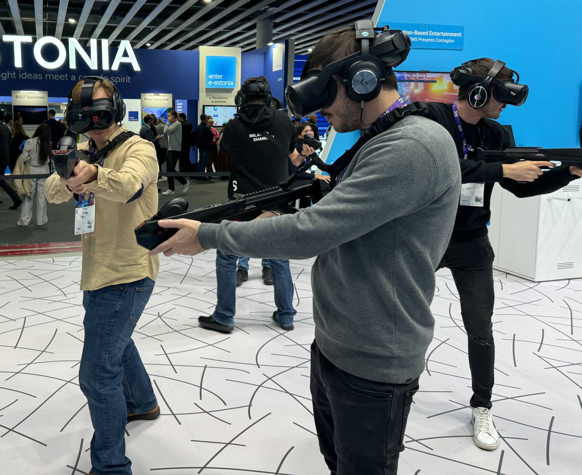 To get to the conference rooms in the rear, you have to walk between the dancing woman and the group of a half-dozen men aiming plastic guns in all directions. Beyond this, a few representatives from third parties are talking up their own wares, including Nord Space ApS, which helped customize an HTC headset for Danish ISS crew member Andreas Mogensen. The startup’s CTO notes that gravity plays a role in many systems’ tracking capabilities. It’s one of a number of things that need to be addressed before spending the tens of thousands of dollars per kilo to send it up.