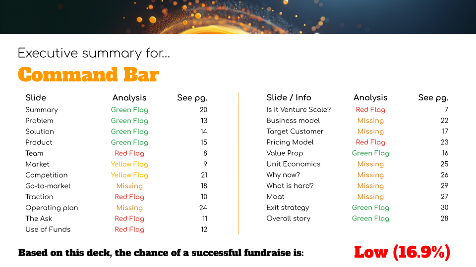 For reference, my AI-powered pitch deck tool gave this deck a 16.9% chance at raising funding.