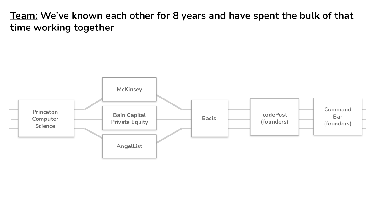 Princeton, McKinsey, Bain Capital, AngelList are all impressive, but nothing about this slide suggests why CommandBar’s founding team is the best team to run this company. And that’s not all; the team slide is often the most important slide in a deck. It should highlight the team’s deep experience, connections or anything else that gives this particular startup a competitive edge.