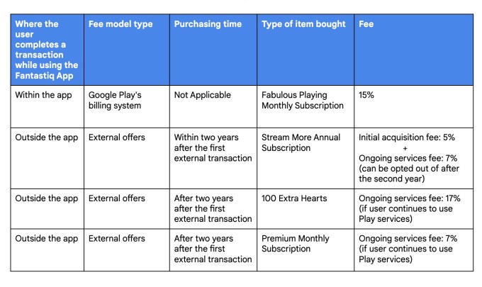 Google today also shared more examples of how this fee structure would look, in action, and answered a series of general questions developers may have — like whether the program is opt-in or opt-out (it’s the former only), if it applies to games and apps alike (yes), whether developers can opt-in only some of their apps (yes) and other technical integration details. It said that developers would have to register for the program as a business, not as an individual. The company noted, too, that developers can continue to use Google Play’s billing system while also participating in the external offers program.