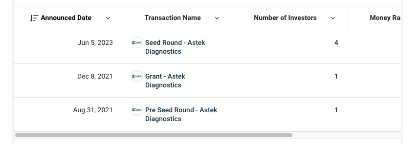 Crunchbase tracked a $125,000 pre-seed round, a $256,000 grant led by the NSF (which turns out to be $275,000) and a $2 million seed round led by Wexford SciTech Venture Fund, which was reported in June 2023.