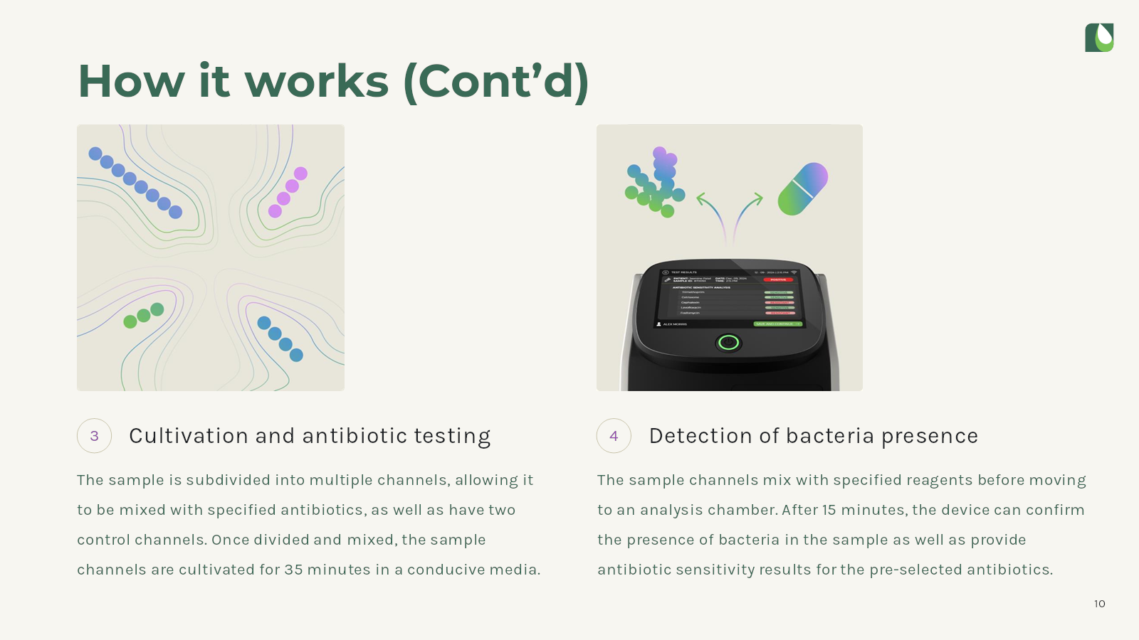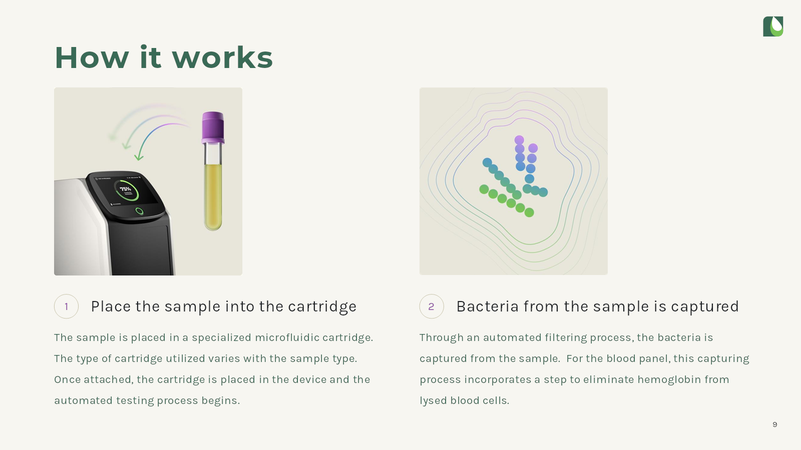 These two slides do a good job explaining how a user would use the product. Insert sample, bacteria are captured, then tested, then you can read what the machine found. From a sales perspective — if I were a buyer of one of these machines — that’s a great top-level view over how a user would use the machine.