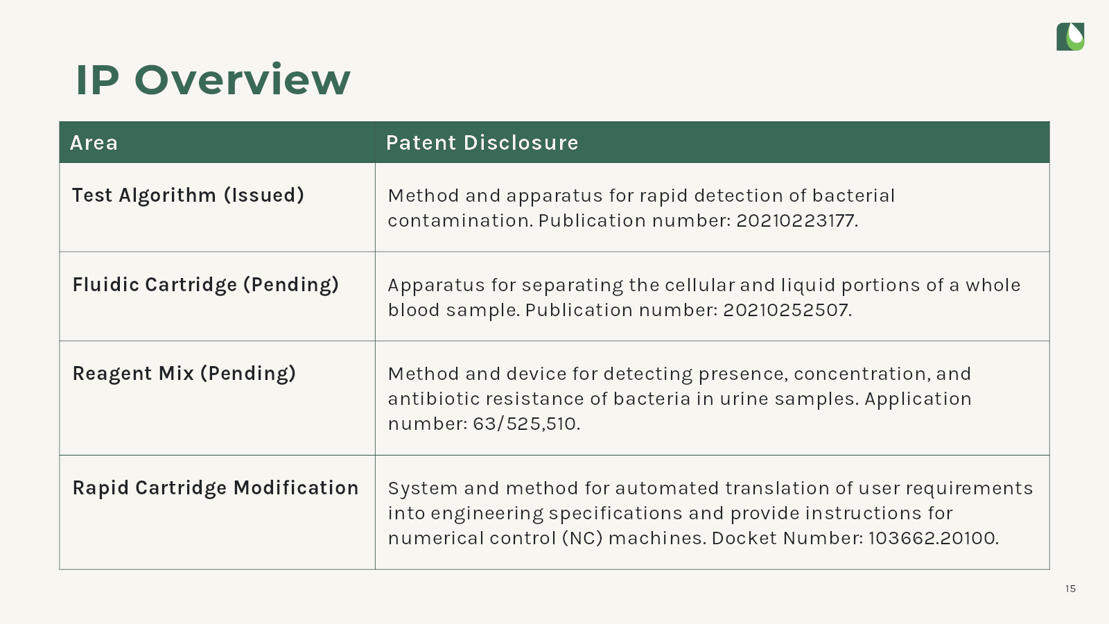 One question I have here is why the Test Algorithm patent is shown with a publication number rather than the patent number; the patent (US11,788,962) was granted in October 2023. The second IP entry — the Fluidic Cartridge patent — is marked as pending, but it’s available to the public.