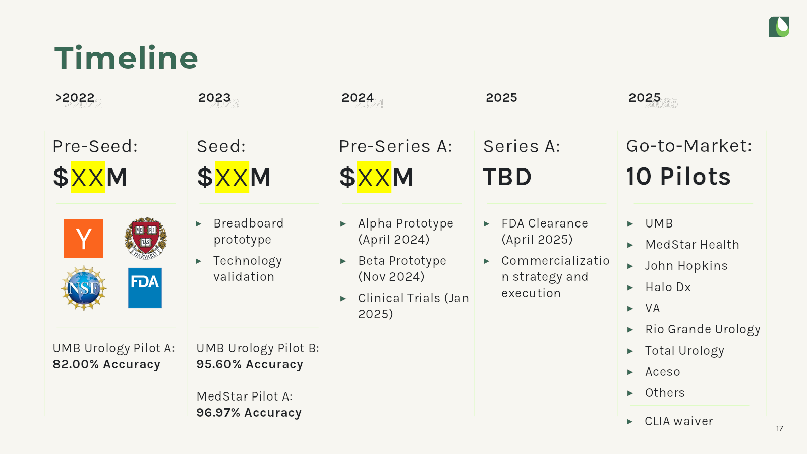 There are a lot of things to worry about on this slide: Raising an amount to “get to Series A Target Milestones” helps answer why the company wrote “pre-Series A” in the previous slides: It’s a bridge round. That could mean two things: