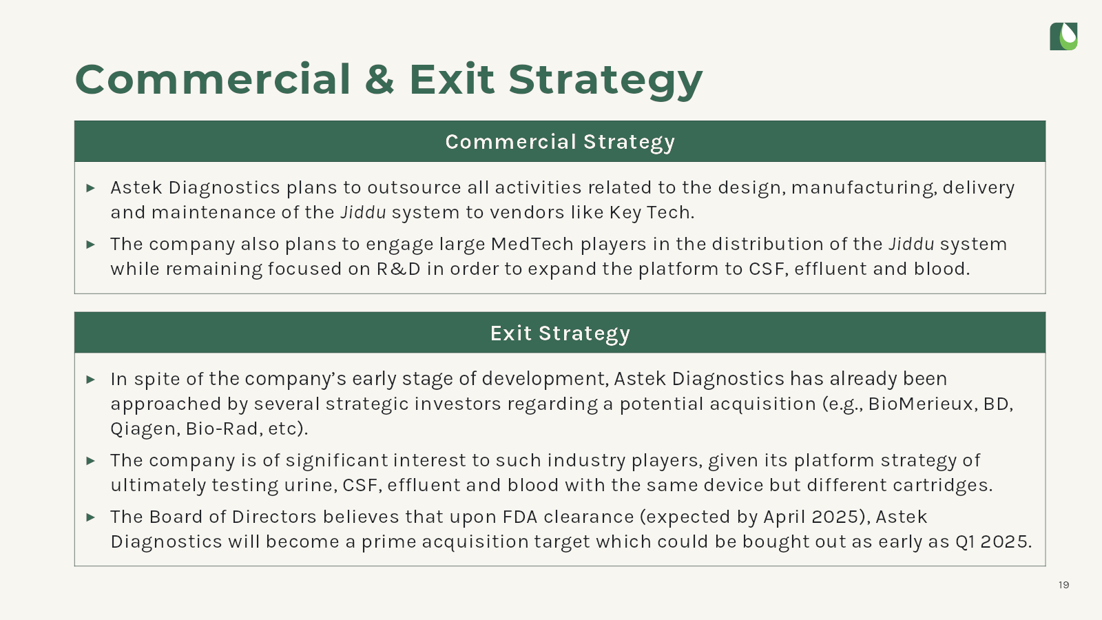 Amazingly, Astek Diagnostics included not one, but two exit strategy slides: