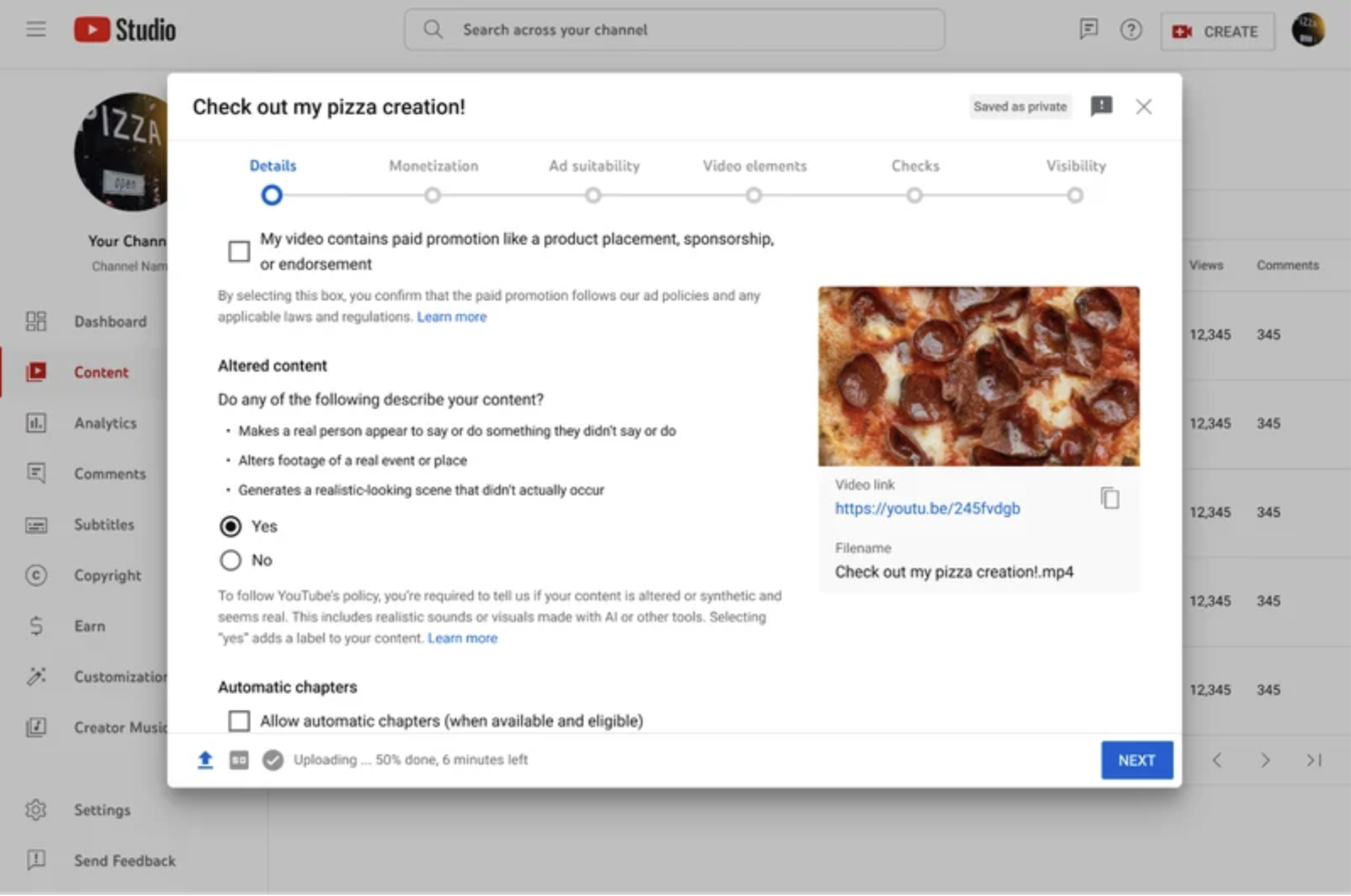 They will also have to disclose content that alters the footage of real events or places, such as making it seem as though a real building caught on fire. Creators will also have to disclose when they have generated realistic scenes of fictional major events, like a tornado moving toward a real town.