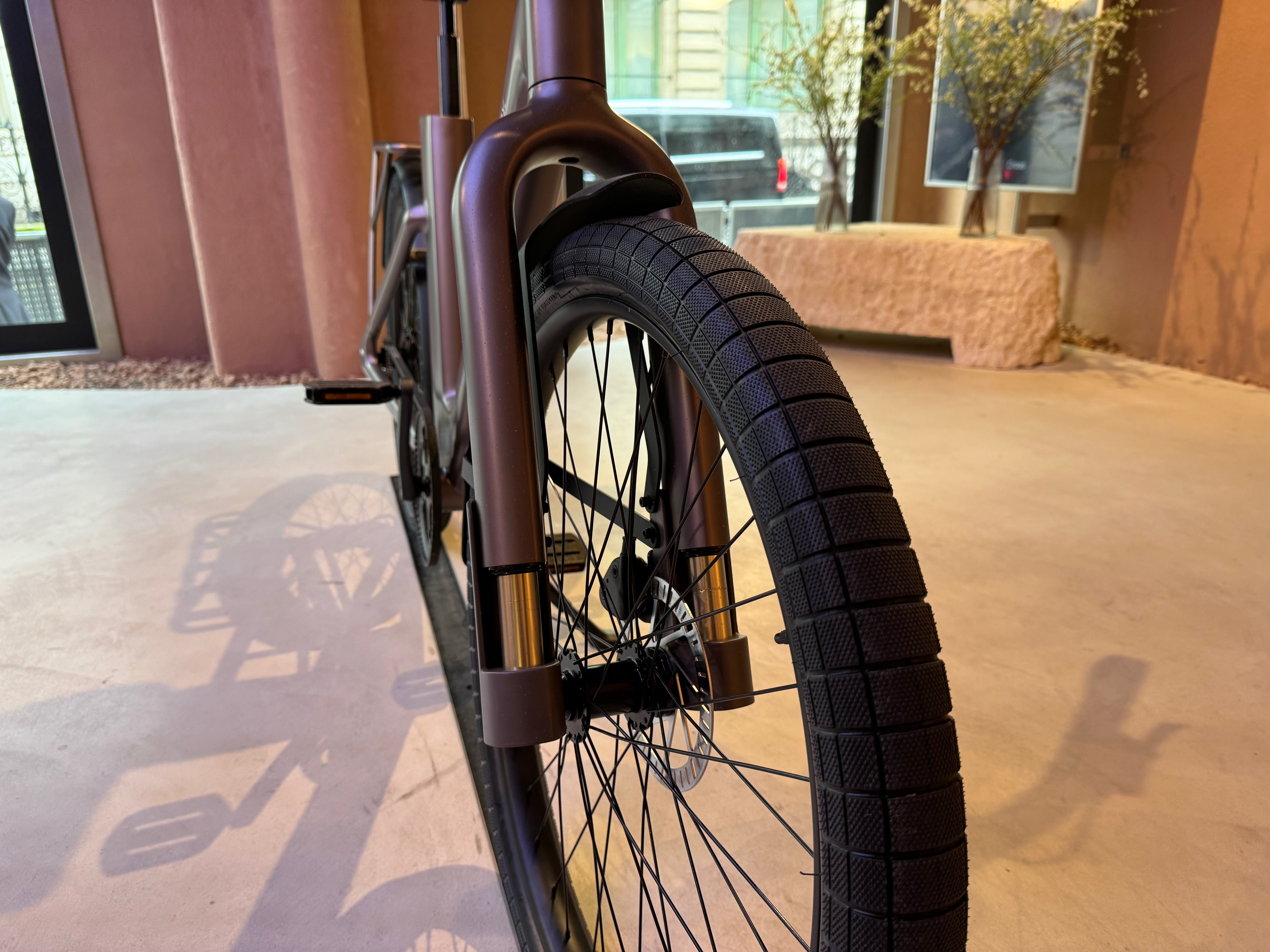 At the front of the bike, you’ll see front fork suspension. But unlike most road bikes, the front fork is inverted with the suspension near the wheel. In addition to a better design, that’s how Cowboy manages to hide the front brake cable in the frame.
