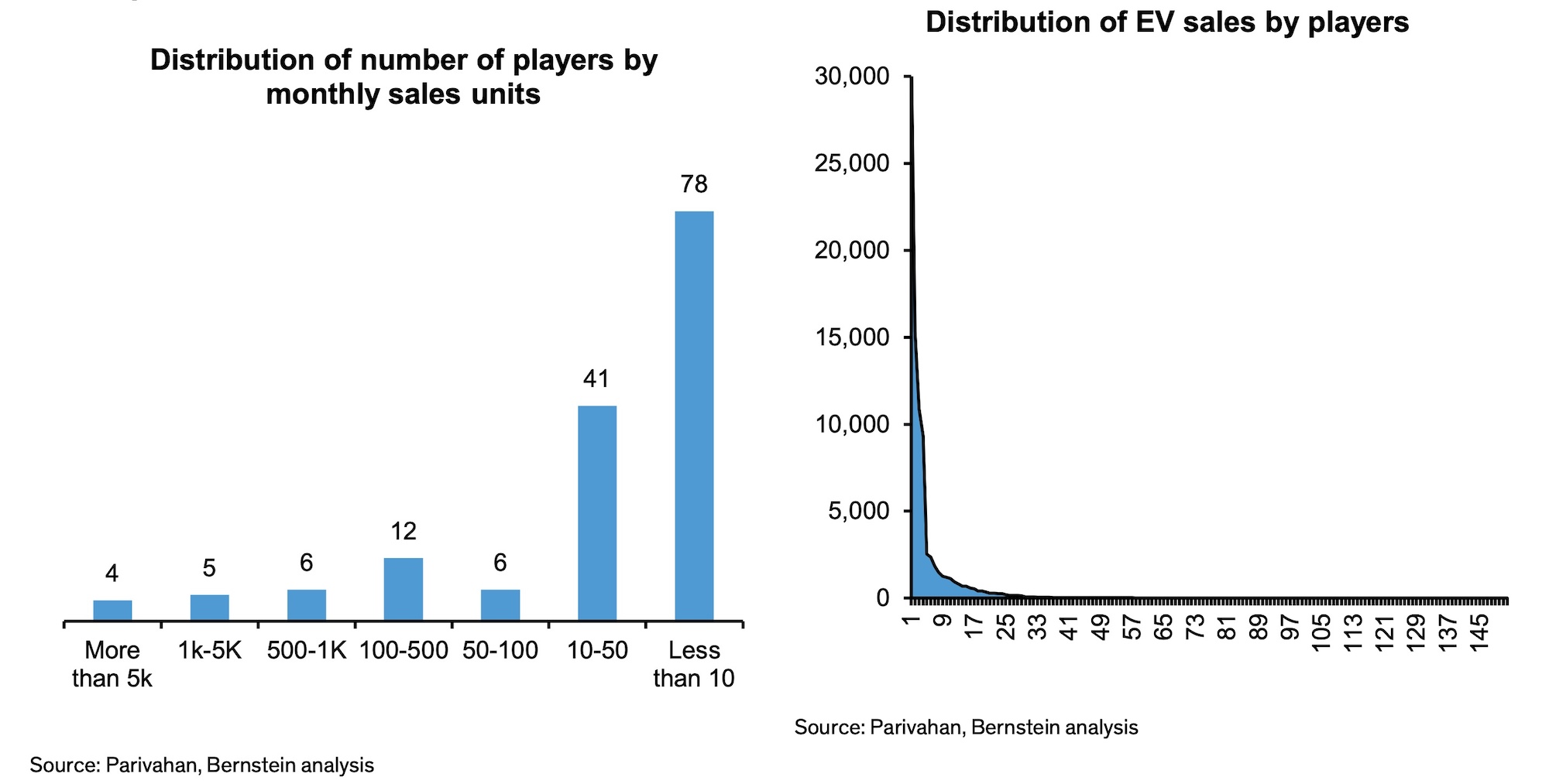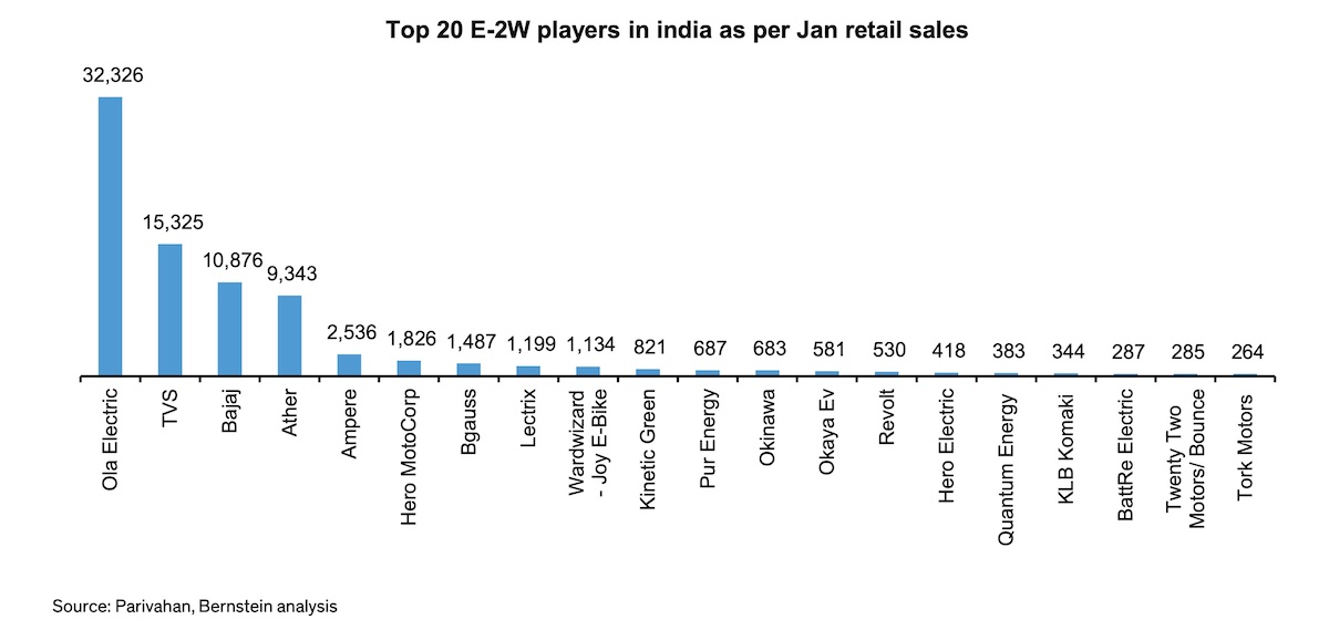 Bernstein’s analysis found low barriers to entry, with electric two-wheelers built using outsourced models and readily available components. Only about half of the 35 founders they analyzed had engineering backgrounds.