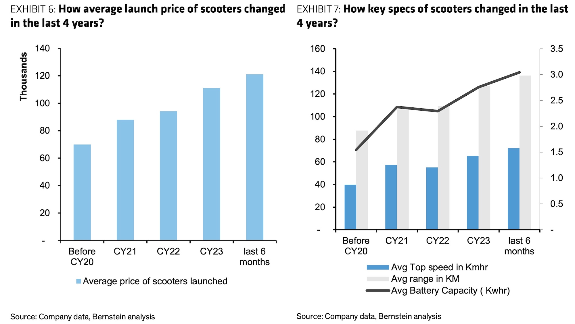 “Most are competing in the mainstream, and 85% of the 65 models launched last year were such products: high-speed as against speed and range-constrained products, which used to be a feature of the startups,” Bernstein analysts wrote. “The average battery capacity for new launches increased from 2.3kWhr in 2022 to 3kWhr.”