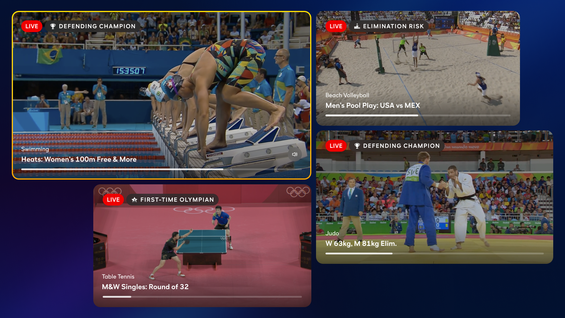 Since up to 40 Olympic events will be happening simultaneously, the unique offering helps viewers determine which four events are the most important. Plus, the feature will showcase tags and descriptions for each match to inform fans which ones have a first-time Olympian or defending champion or if there’s an elimination risk.