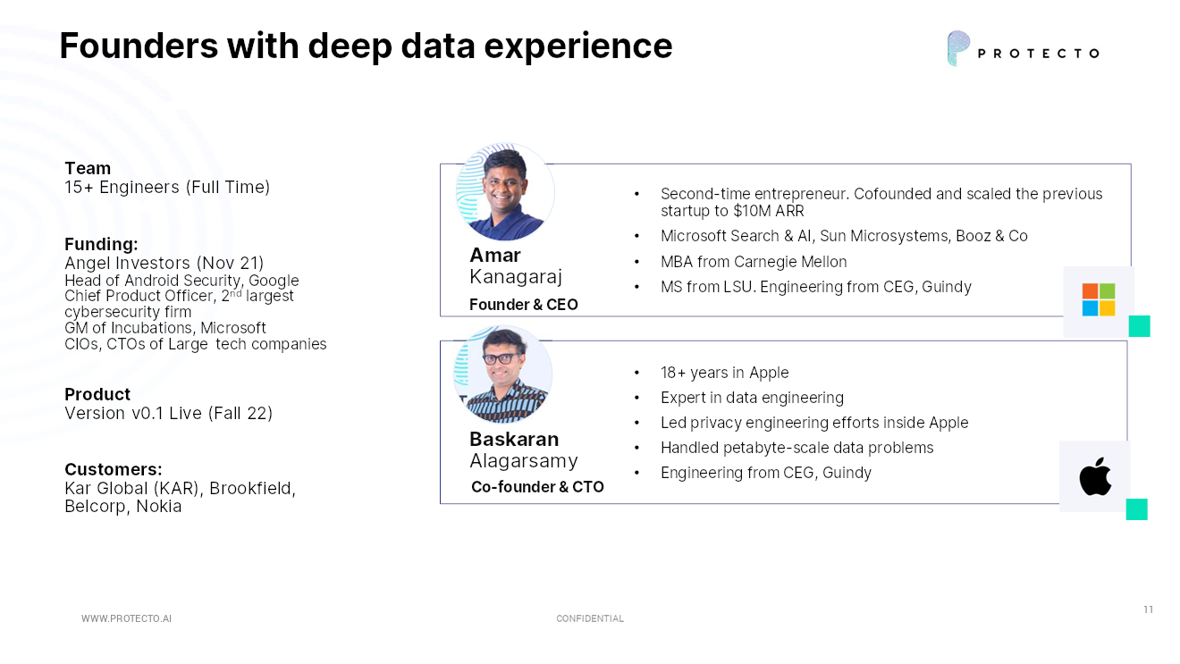 According to his LinkedIn, CEO Amar Kanagaraj spent almost eight years at Microsoft, including a stint in search and AI. CTO Baskaran Alagarsamy spent seven years as a “manager” at Apple India. I’d have loved to see more detail on exactly what he was managing there (and why this slide says 18 years, while his LinkedIn says seven years), but this is the beginning of a really solid team. If I were investing in this space, a team of this caliber would pique my interest and I would probably set up a meeting.