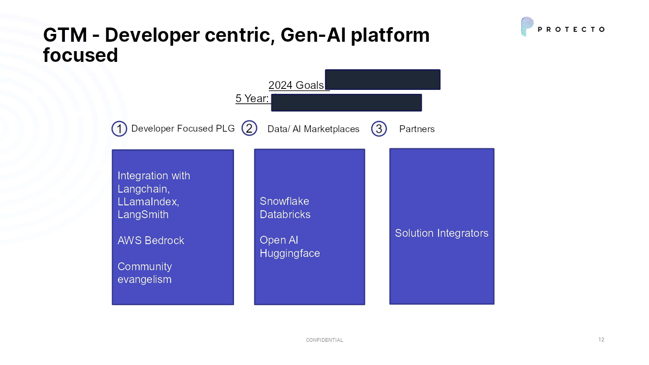 Protecto made redactions to the short-term and five-year goals and to specific details of the near-term product roadmap before submitting its deck to TechCrunch. The timeline for the goals and milestones related to the seed funding round was also redacted. Still, there’s plenty to learn from the 14-slide deck: