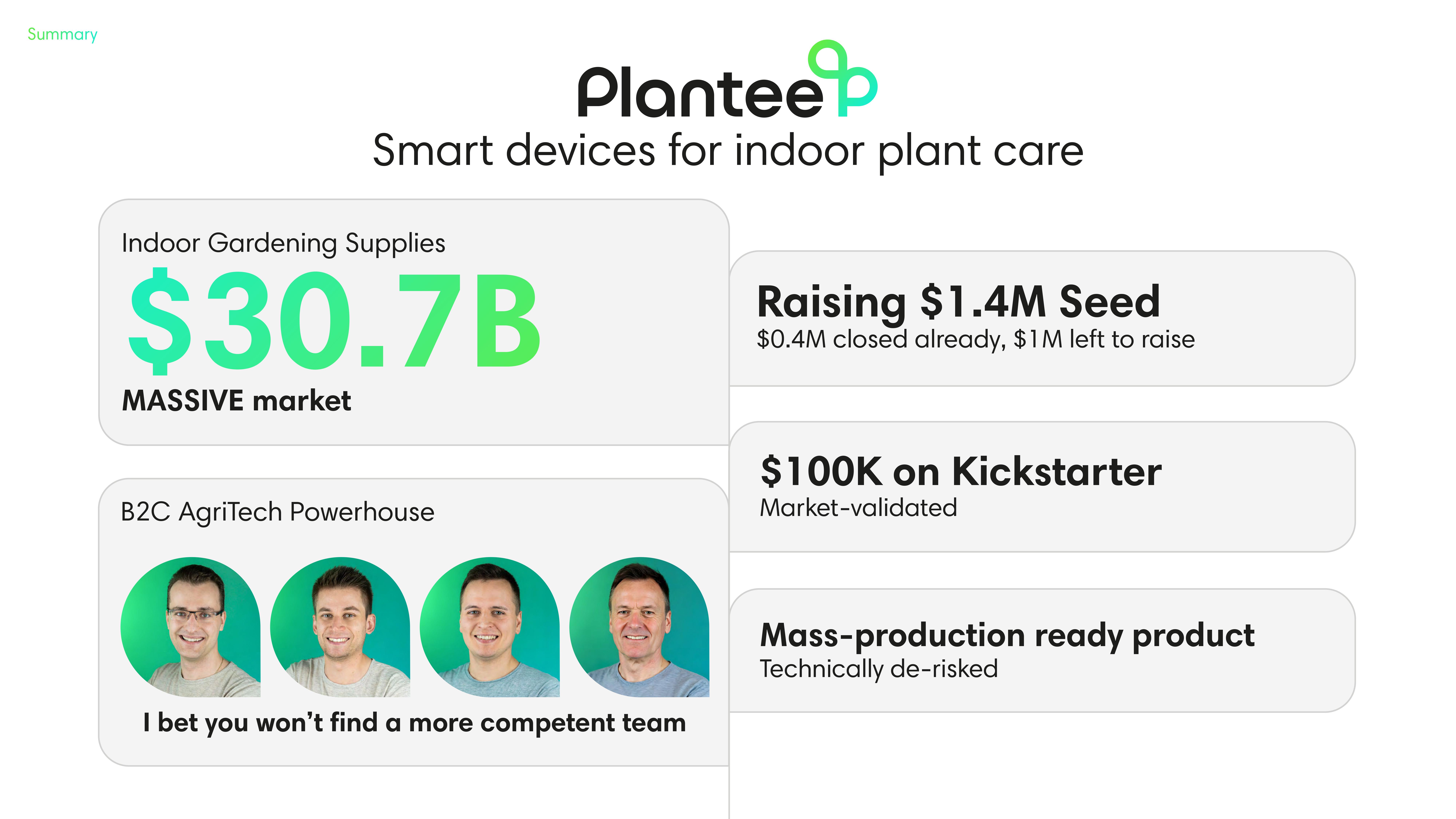 It’s rare that I come across a pitch deck that ticks almost all the boxes. It’s so good, in fact, that I fed Plantee’s deck into an AI tool I built, and it determined there was a 97.7% chance that Plantee would raise money. This tool generally determines that only about 7.5% of all pitch decks are up to scratch, so Plantee’s is positively off the charts.