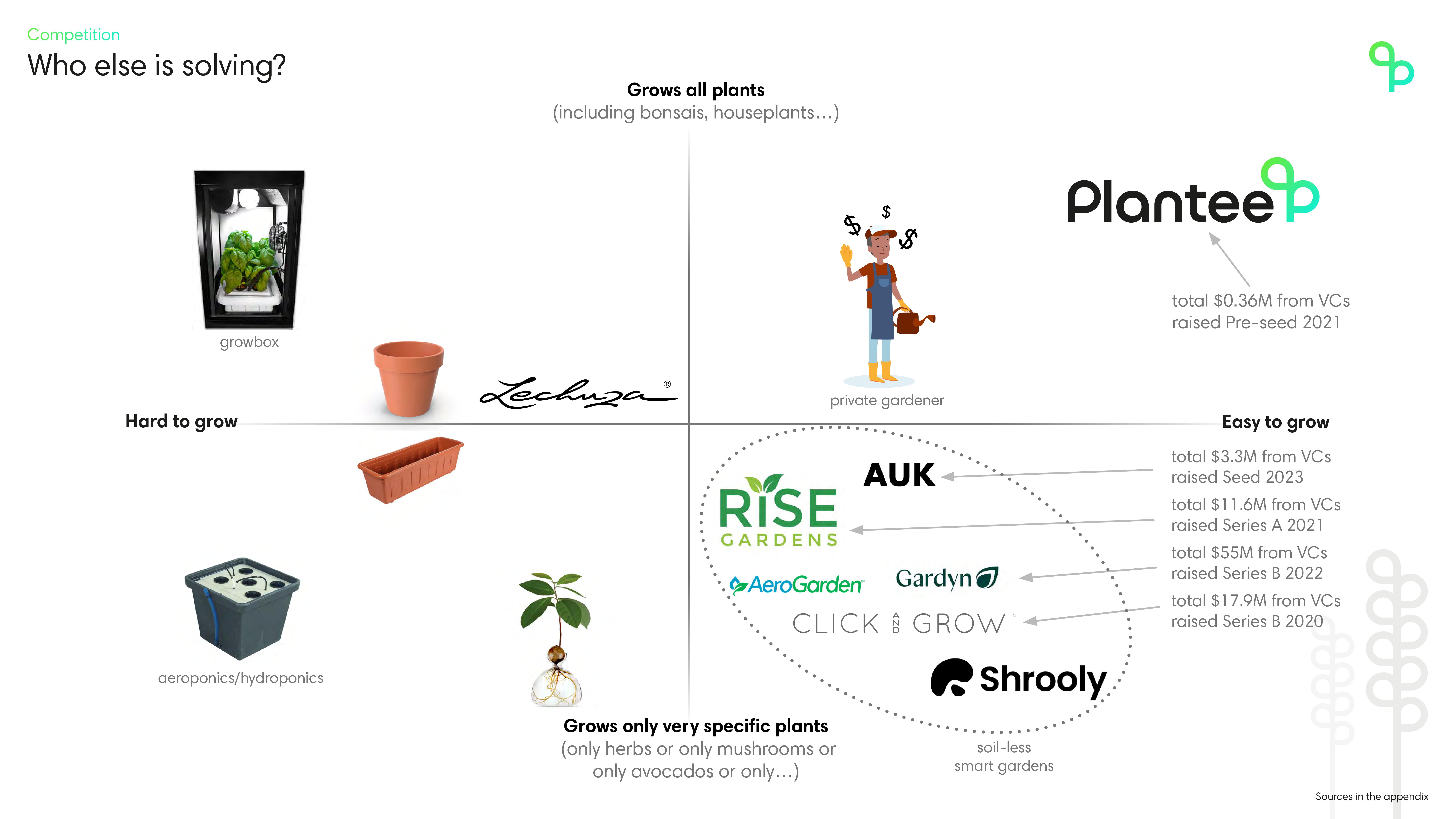 This is a market that doesn’t have many competitors. Seen through one lens, that’s a good thing: It means that there’s a thriving market, and Plantee can see what its competitors are doing well or poorly and position itself accordingly.