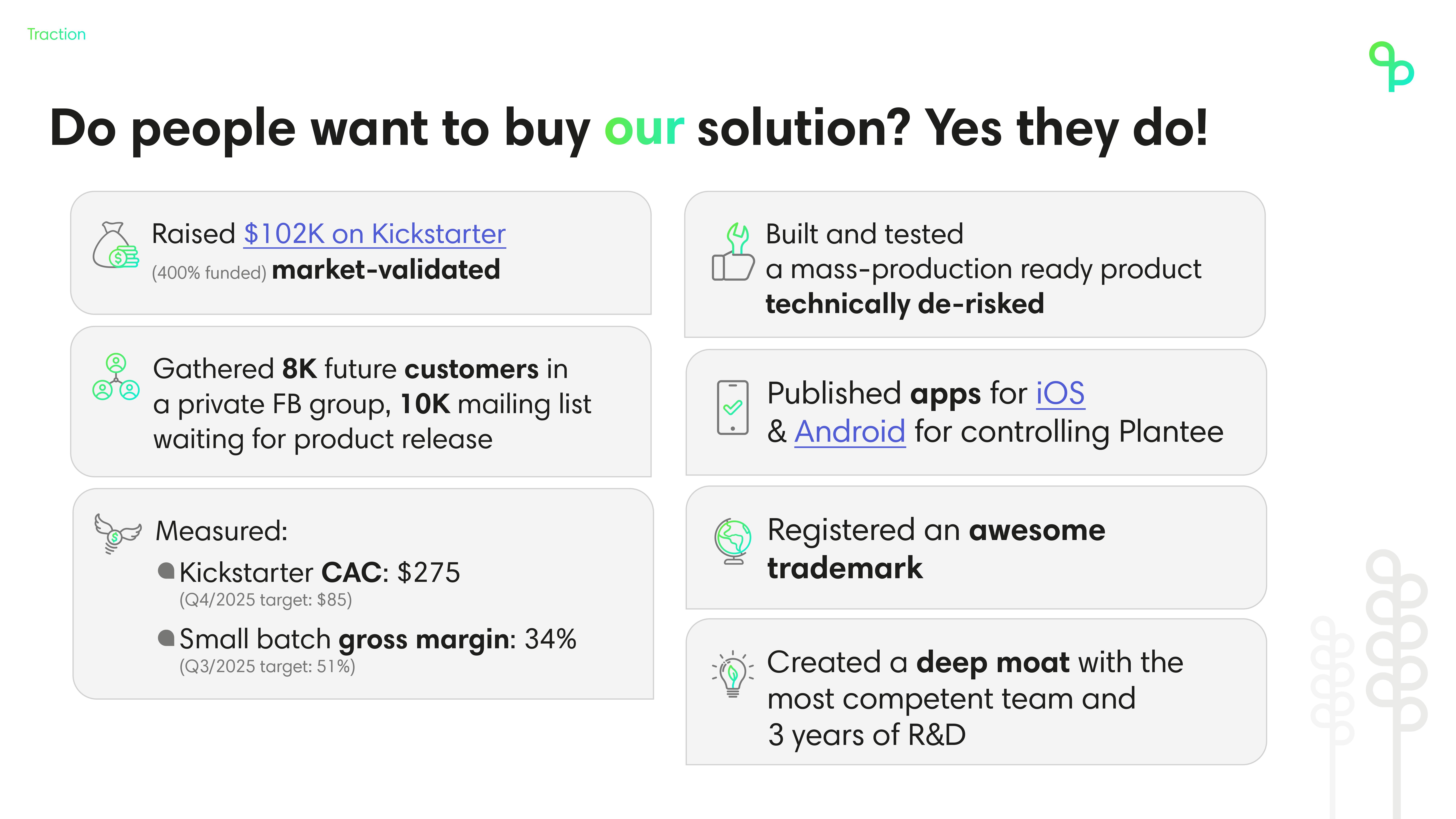 Put simply, I’m struggling to figure out how the Kickstarter campaign fits into the overall narrative, and by seeming to skirt the issue within the deck, Plantee isn’t doing itself any favors. Perhaps I’m being painfully sensitive after one of my own Kickstarter campaigns went down in flames a decade ago, and eventually took the whole company with it, but personally, I’d include a “so, what happened with the Kickstarter” slide in the appendix to get ahead of that part of the story. Bad news should travel fast.