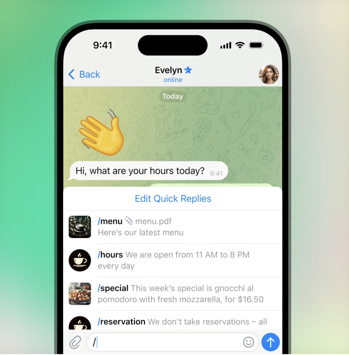 For instance, businesses can choose to display their hours of operation and location on a map, and greet customers with a customized start page for empty chats where they can choose the text and sticker users see before beginning a conversation. Similar to features available on WhatsApp, Telegram Business will offer “quick replies,” which are shortcuts to preset messages that support formatting, links, media, stickers and files.