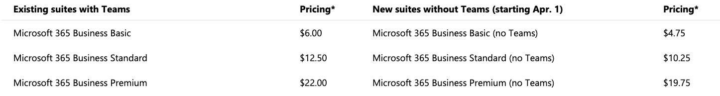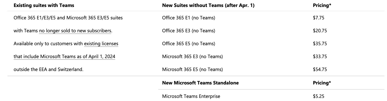 For new customers, Microsoft has introduced standalone pricing for Teams at $5.25 per user per month. Additionally, Office packages without Teams will be available at prices ranging from $7.75 to $54.75, depending on the specific package and features included.