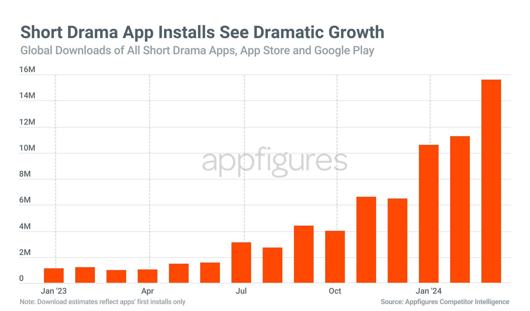 It appears the revenue growth began to accelerate in fall 2023, per Appfigures data, leading to a huge revenue jump between February and March of this year, when global revenue grew 56% to reach $65.7 million, up from $42 million. In part, the revenue growth is tied to the larger number of apps available, of course, but marketing, ad spend and consumer interest also played a role.