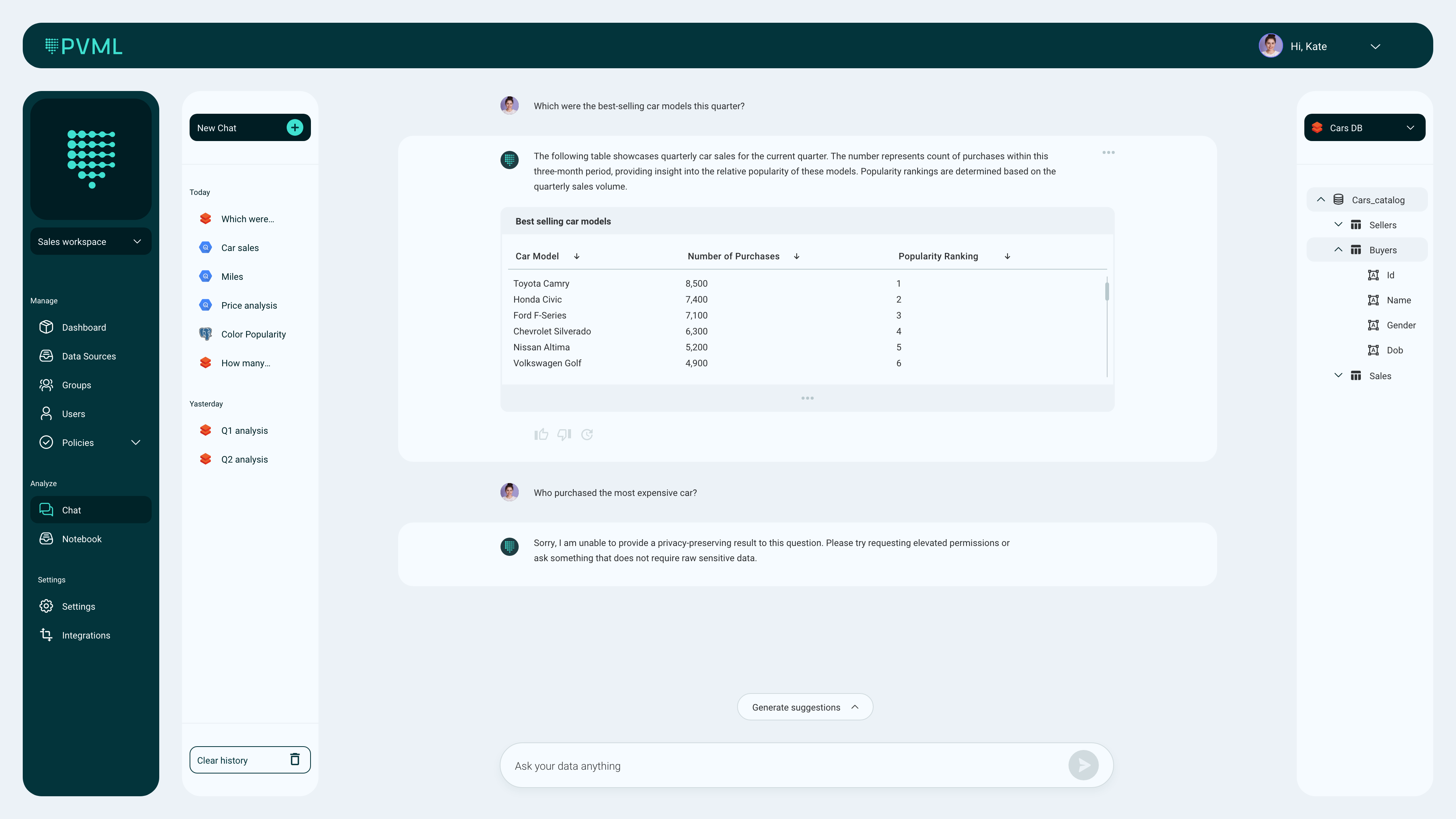 None of the differential privacy work would matter if PVML’s actual data analysis tools and platform weren’t useful. The most obvious use case here is the ability to chat with your data, all with the guarantee that no sensitive data can leak into the chat. Using RAG, PVML can bring hallucinations down to almost zero and the overhead is minimal since the data stays in place.